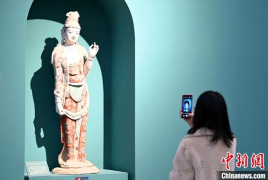 圖為3月3日,市民參觀莫高窟彩塑臨摹品。 中新社記者 九美旦增 攝
