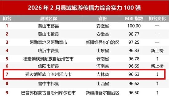近日,邁點研究院獨家發(fā)布2026年2月縣域旅游傳播力綜合實力100強榜單,延吉市強勢上榜,位列第7名。