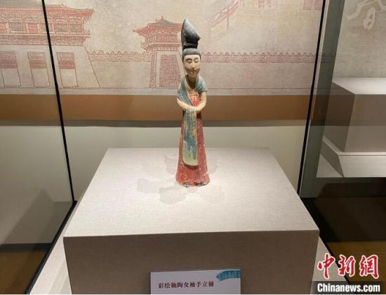 2023年12月,在吉林長春舉辦的“柳絲梅綻正芳菲——初唐女性生活掠影展”上,展出的昭陵陪葬墓出土的袖手女立俑(中),頭梳雙螺髻!±畹 攝