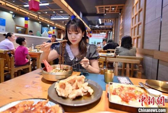 7月23日,吉林長春,食客體驗延吉冷面配鍋包肉的“冷熱配”吃法!≈行律缬浾 張瑤 攝