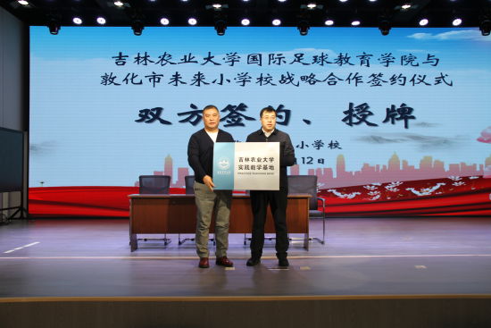 為進一步深化高校與基礎(chǔ)教育合作,推動實踐育人協(xié)同發(fā)展。近日,吉林農(nóng)業(yè)大學(xué)國際足球教育學(xué)院校外實踐教學(xué)基地與敦化市教育局戰(zhàn)略合作簽約儀式在敦化市未來小學(xué)校舉行。教育部東北校園足球發(fā)展研究中心秘書長、吉林省學(xué)生體質(zhì)健康研究中心主任、吉林農(nóng)業(yè)大學(xué)國際足球教育學(xué)院院長張志成同志,吉林農(nóng)業(yè)大學(xué)國際足球教育學(xué)院副書記趙立剛同志及學(xué)院一行人員,敦化市教育局黨組書記、局長姬廣建同志,敦化市教育局黨組成員、教育工委專職副書記張冬輝同志,以及卓越科技有限公司代表等出席了本次活動。