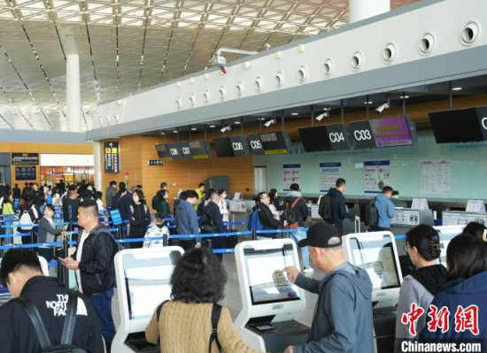 清明假期,旅客在長(zhǎng)春龍嘉國(guó)際機(jī)場(chǎng)排隊(duì)值機(jī)。(吉林機(jī)場(chǎng)集團(tuán)供圖)