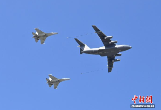 9月16日,吉林長(zhǎng)春,運(yùn)油-20A(右一)與殲-16雙機(jī)編隊(duì)通場(chǎng)。 張瑤 攝
