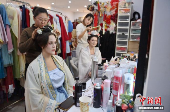 11月9日,在吉林長(zhǎng)春的一家漢服體驗(yàn)館,德國友人身著精美漢服拍攝寫真。近年來,漢服日益受到外籍人士青睞。該館已為超百名外籍人士提供漢服體驗(yàn)和拍攝服務(wù),讓他們?cè)诔两脚臄z中,了解中國傳統(tǒng)文化。中新社記者 張瑤 攝