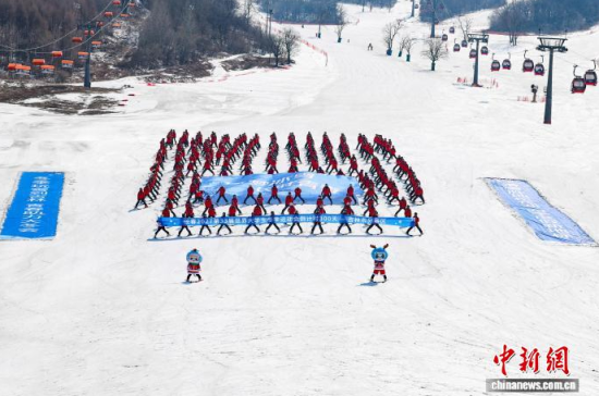 吉林中旅松花湖雪場的滑雪方陣展示長春大冬會吉祥物。 石洪宇 攝