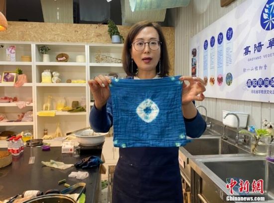 這是河北省級非物質(zhì)文化遺產(chǎn)項目“高陽民間染織技藝”傳承人段惠,展示中國草木染及傳統(tǒng)扎染技藝的一幕!叭疽菏怯棉に{、菘藍(板藍根)等藍草提取出的,這些藍草是最古老的染材!倍位菡f。