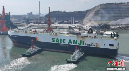 中新網(wǎng)寧德10月27日電 (范正雄)27日上午,裝載著上汽寧德基地生產(chǎn)的991輛名爵汽車的大型滾裝船“上汽安吉鳳凰”輪,在位于福建省寧德市的寧德口岸漳灣寧連碼頭7號泊位出港,將航行至連云港,繼續(xù)裝車后駛往沙特阿拉伯。