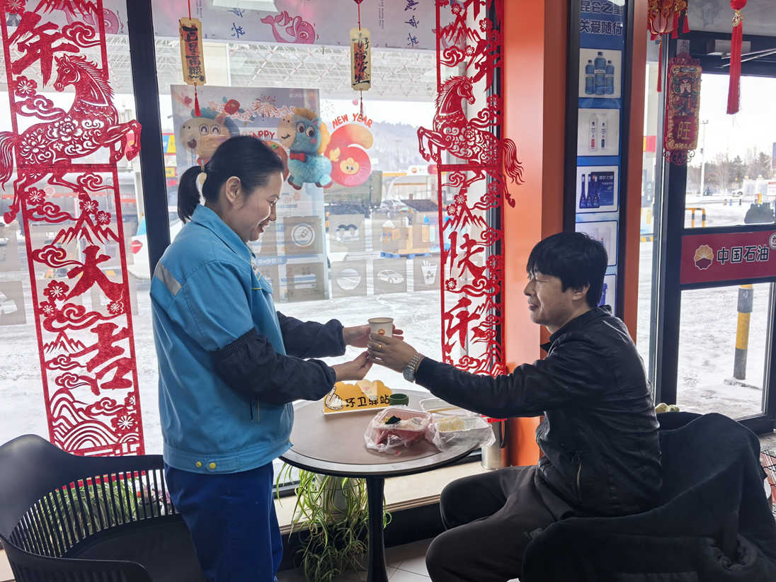 2月24日,節(jié)后返工返程客流持續(xù)攀升,駕車返程的劉先生駛?cè)胫袊?guó)石油吉林銷售公司四平分公司九間房加油站,一杯熱氣騰騰的茶水便送到手中,劉先生高興地說(shuō):“路上喝杯熱茶,心里熱乎乎的!