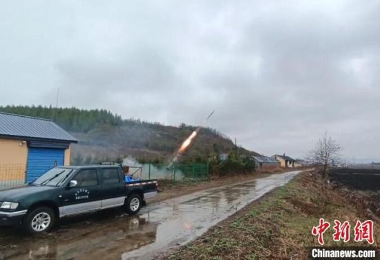 工作人員發(fā)射地面增雨火箭!〖质∪斯び绊懱鞖廪k公室供圖