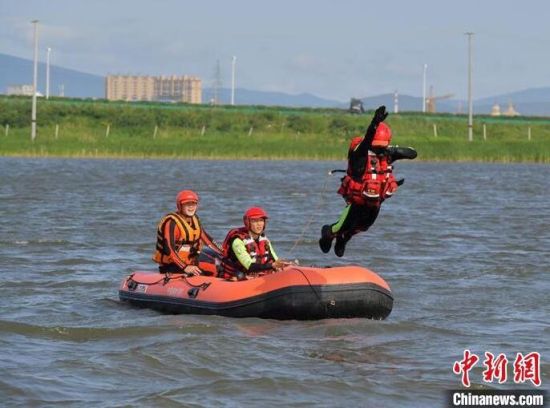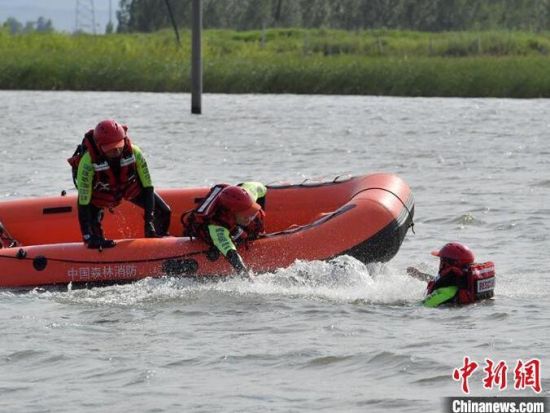 森林消防員正在進(jìn)行水上救援科目訓(xùn)練。