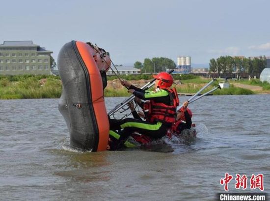 森林消防員正在進(jìn)行翻舟自救科目訓(xùn)練。