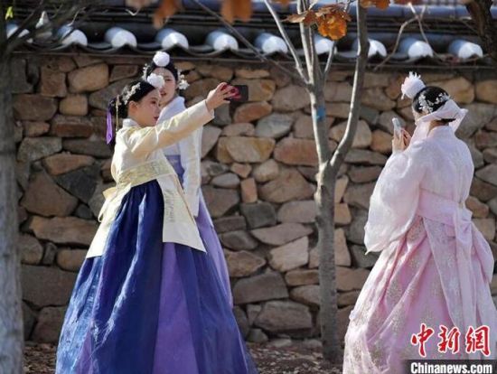 11月4日,在吉林省延邊朝鮮族自治州延吉市的中國(guó)朝鮮族民俗園內(nèi),游客身著朝鮮族服飾拍照留念。延邊是中國(guó)最大的朝鮮族聚居區(qū),濃郁的民族風(fēng)情吸引大量游客前來觀光體驗(yàn)。