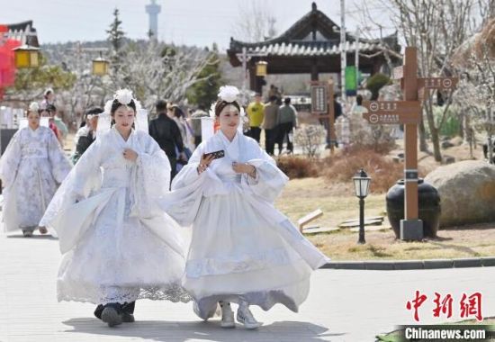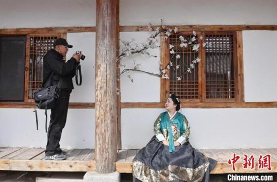 4月7日,在吉林省延邊州延吉市的中國朝鮮族民俗園內(nèi),游客身著朝鮮族服飾拍照。延邊是中國唯一的朝鮮族自治州和最大的朝鮮族聚居地,近年來延邊旅游持續(xù)火爆,朝鮮族服飾旅拍也成為最受歡迎的旅游項目之一。