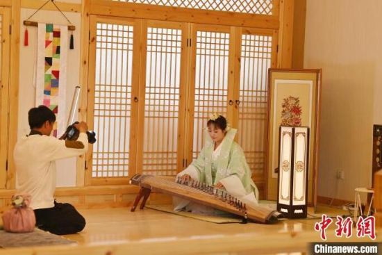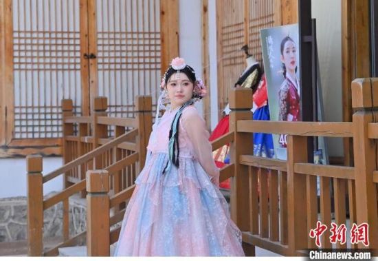 在吉林省延邊州延吉市的中國朝鮮族民俗園內(nèi),游客身著朝鮮族服飾拍照。張瑤 攝