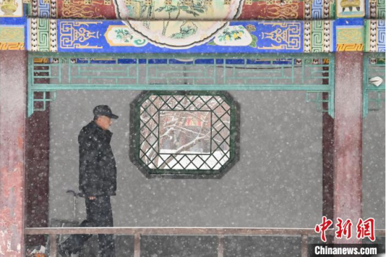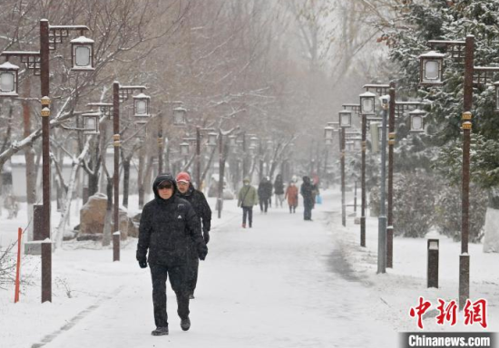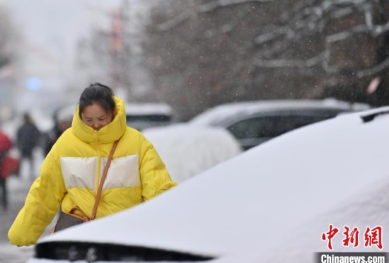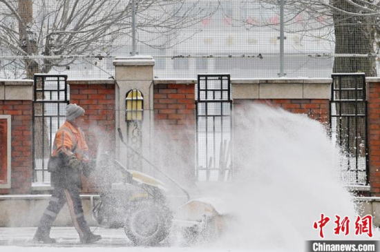 11月26日,吉林長春,市民在清掃車上的積雪。當天,吉林長春迎來今冬首場明顯降雪天氣,整座城市披上銀裝。 中新社記者 張瑤 攝