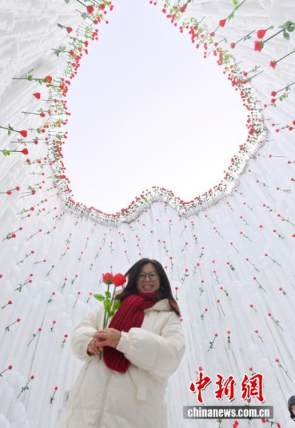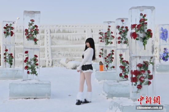 1月13日,在長春云瑯冰雪公園內,一組別具匠心的玫瑰冰雪景觀吸引了眾多游客。中新社記者 張瑤 攝